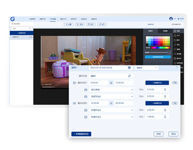 数字化信息发布管理系统GDSM-C区别于传统信息发布方式,能有序高效地发布节目,管理系统简洁方便,可操性高。可直接利用后台轻松进行节目设计,多样化素材可供选择,易于维护。