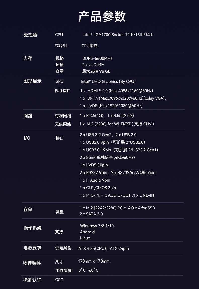 IB5-8131配备了全面的I/O端口阵列,包括USB、显示等接口;采用6+1相供电,即使在长时间高负载工作时也能维持稳定运行,支持全天候24小时连续运转,为自助服务终端提供了最强大脑。
