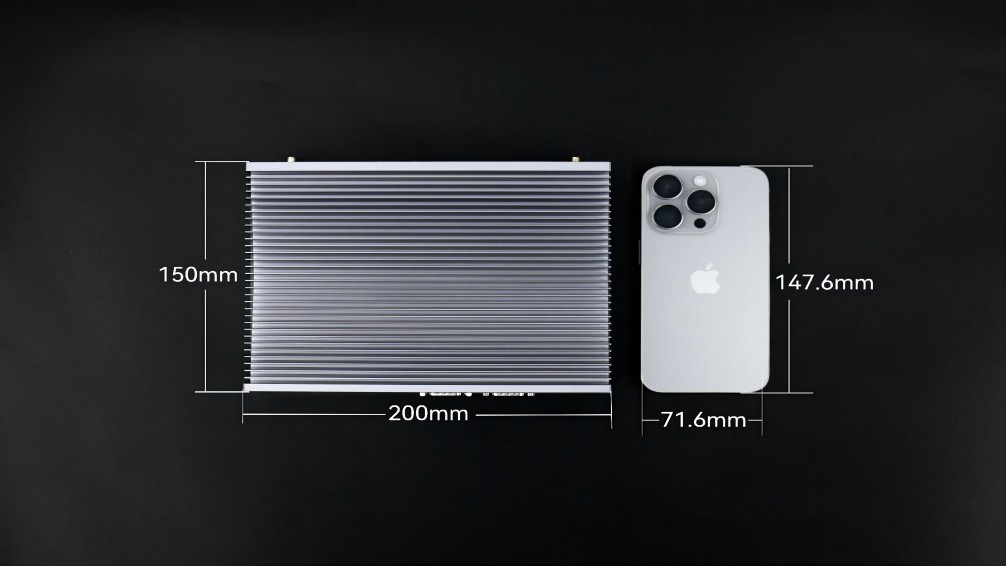 没有了风扇这一部件,体积也更为小巧,能轻松嵌入各类设备或狭小空间,完美贴合特定场景需求,例如:球速体育AE613,其三围尺寸是200mm x 150mm x 50mm,与iphone15的尺寸对比,宽度仅比其高度多2.4毫米,体积仅有1.5L。