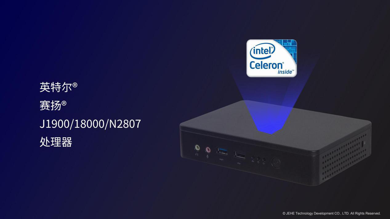 球速体育科技VT20桌面云终端搭载了知名度很高赛扬®J1900处理器。在嵌入式应用中,赛扬®J1900处理器主打的高单核运算频率(2.4GHz单核睿频)和低功耗(10W),非常适合面向复杂的嵌入式场景。此外,球速体育VT20适配了其他两款性能较低的BayTrail平台处理器,赛扬®N2807和赛扬®J1800,对于客户端性能要求相对较低的方案依然能够匹配需求。