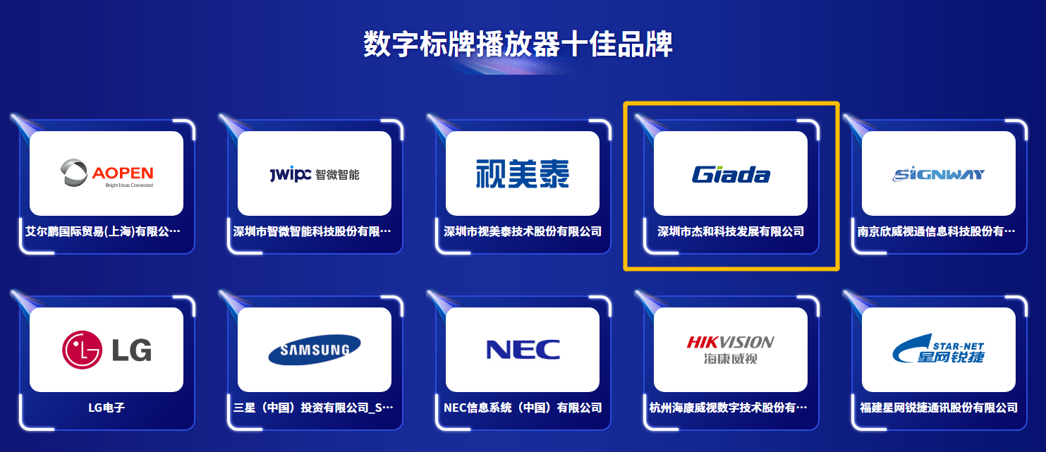 Giada球速体育科技凭借突出的市场竞争力、强劲的产品创新力、卓越的产品成长力、领先的品牌影响力,从众多候选企业中脱颖而出,斩获“优秀多媒体信息发布系统品牌大奖”、“优秀播放器品牌大奖”两项荣誉。Giada球速体育科技已连续四年登上领奖台。