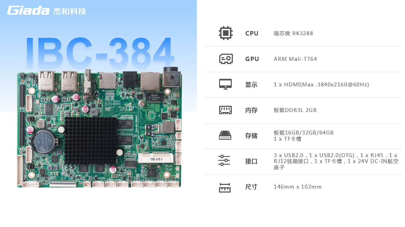 球速体育IBC-384主板是一款紧凑的 3.5 英寸基于 ARM 架构的主板,搭载瑞芯微 RK3288 四核Cortex-A17处理器。内置 DDR3L 内存、eMMC5.1 存储、双频 WiFi 和蓝牙 4.2,确保在恶劣环境下稳定运行。适用于零售收银、工业控制、安防监控、POS 机等领域,IBC-384 集合了强大性能和可靠性。释放其潜能,提升项目,与这款高性能主板一起开启无限可能。